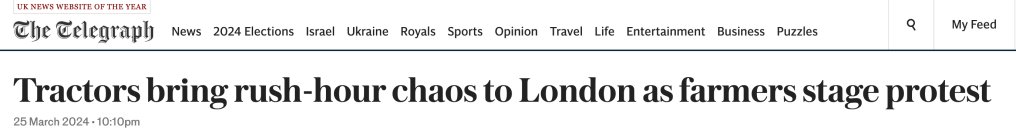 March 25, 2024, London, England, United Kingdom: Farmers bring their tractors into London during a protest organized by Save British Farming and Farmers for Fairness. The rally aims to highlight three key asks, that the government acts to block substandard imports, puts an end to ‘dishonest’ food labeling, and takes more action to address food security in the UK. (Credit Image: © Cal Ford/ZUMA Press Wire)