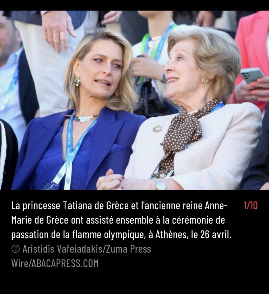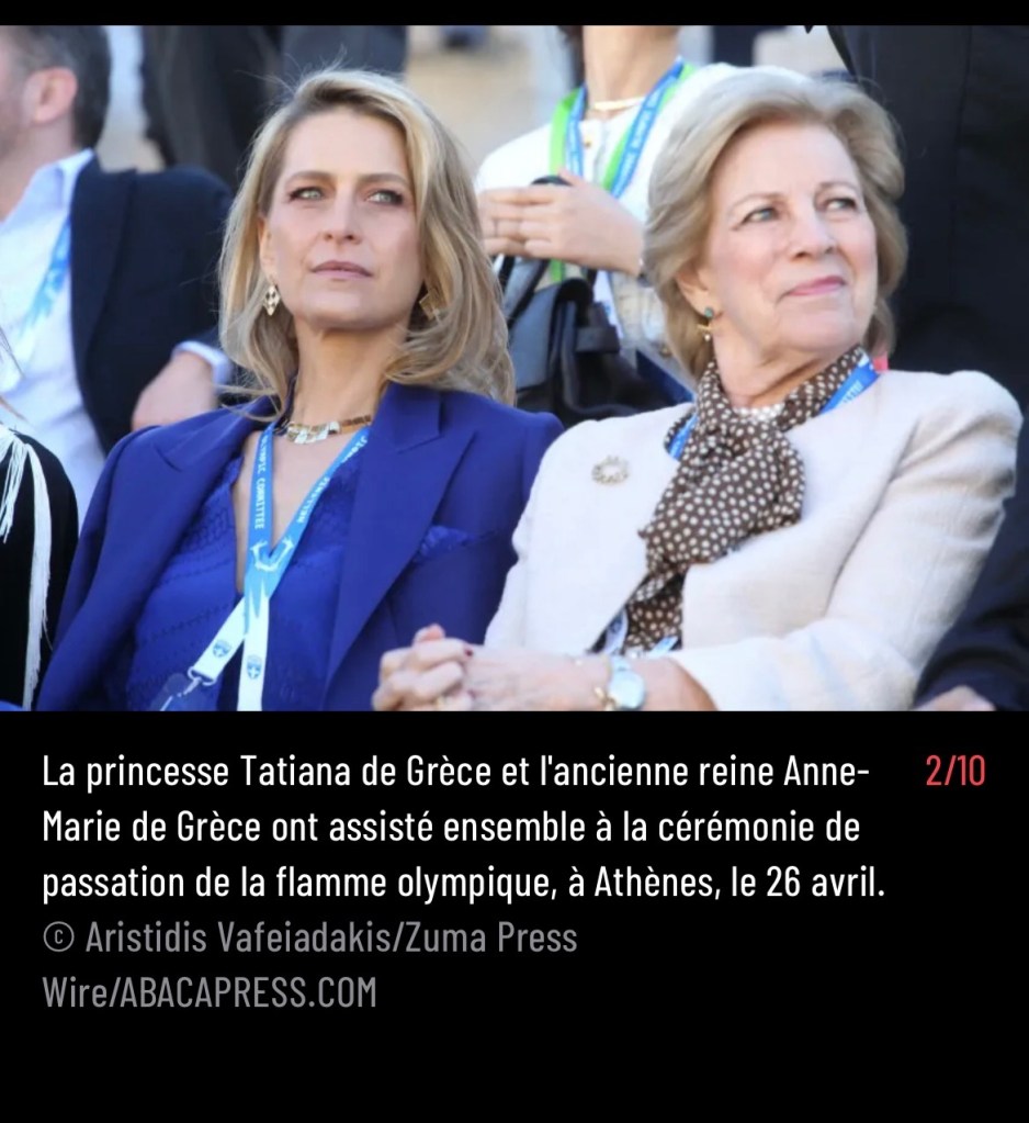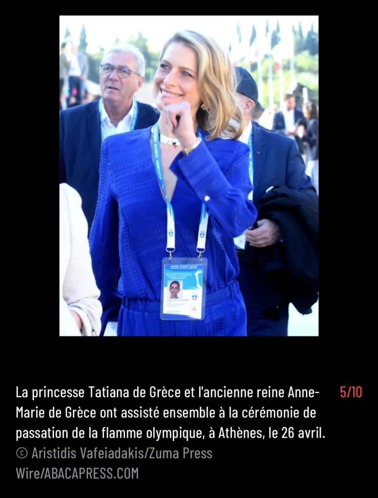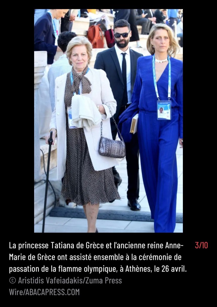 A series of five images made by ZUMA’s Aristidis Vafeiadakis from April 26, 2024 of Princess Tatiana and Queen Anne-Marie, of Greece, attending the Olympic Handover ceremony in Athens appear in a gallery on French Paris Match.
