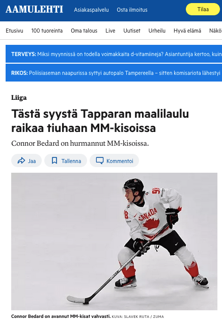 ZUMA’s Slavek Ruta on Finnish Paper Aamulehti Posted by ZUMAPRESS.com on May 16, 2024 Posted in: ZUMALAND. Leave a comment May 11, 2024, Prague, Czech Republic: CONNOR BEDARD of Canada during the 2024 IIHF Ice Hockey World Championship match between Great Britain and Canada at the O2 arena. (Credit Image: © Slavek Ruta/ZUMA Press Wire) Share this: Share on Facebook (Opens in new window) Facebook Share on LinkedIn (Opens in new window) LinkedIn Share on X (Opens in new window) X Like Loading... Related Posts navigation ← ZUMA’s Slavek Ruta on Estonian Daily Postimees ZUMA’s Liau Chung Ren on DW →