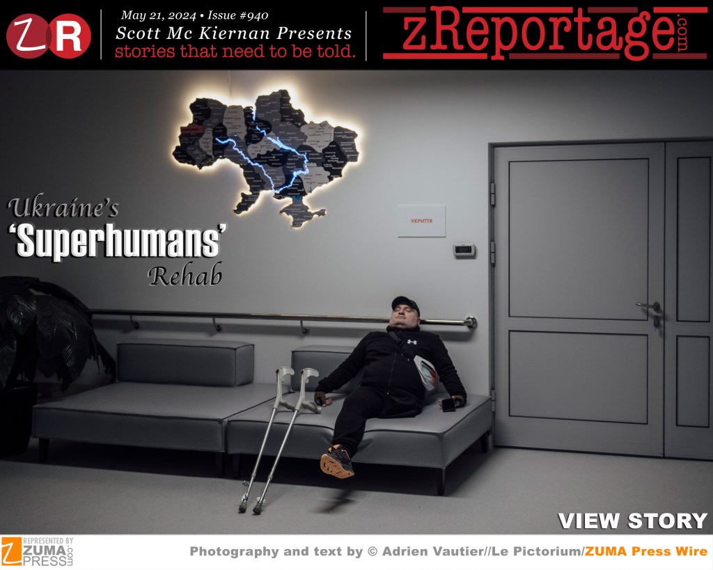 Scott Mc Kiernan Presents zReportage.com Issue #940 Story of the Week: Published TUESDAY May 21, 2024: Ukraine’s ‘Superhumans’ Rehab by ZUMA Partner agency Le Pictorium photo-journalist Adrien Vautier: As the war in Ukraine rages on, a critical need has emerged, with some 20,000 to 50,000 Ukrainians forced to amputate one or more limbs. The Ukrainian non-profit Superhumans Center is helping survivors move forward, offering reconstructive surgery and physical and psychological support. Located in the west of the country, the rehabilitation site takes in combatants who have suffered one, two or even four amputations. Thousands of Ukrainians have suffered life-changing injuries, wounded on the battlefield and on the street. This modern rehabilitation center for adults and children in Ukraine gives these people the superhero life they deserve. Welcome to ‘Ukraine’s ‘Superhumans’ Rehab’