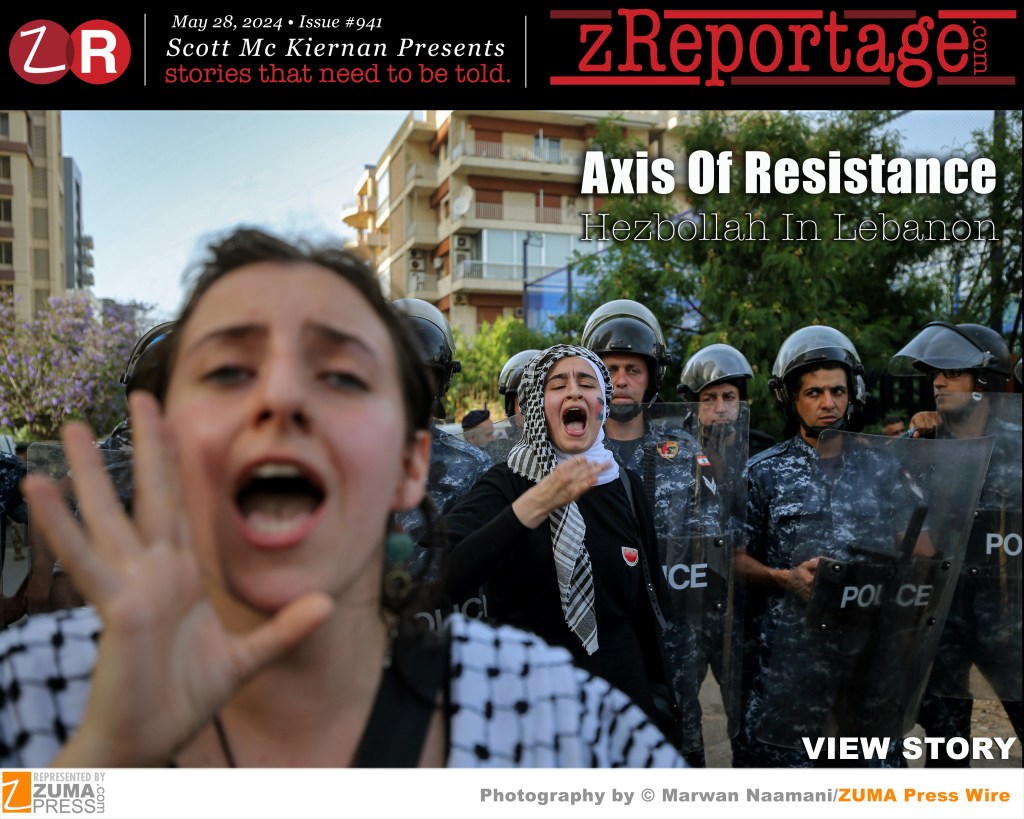 Scott Mc Kiernan Presents zReportage.com Issue #941 Story of the Week: Published TUESDAY May 28, 2024: ‘Axis Of Resistance’ by ZUMA Press award winning photo-journalist Marwan Naamani: Hezbollah, the Shia movement created more than forty years ago in Lebanon, is one of the most successful and heavily armed non-state actors in recent history. With tens of thousands of battle hardened fighters and backing from Iran, Hezbollah poses a serious threat to Israel. The group has joined the war between Israel and Hamas and has displaced tens of thousands of Israelis from their homes in the Galilee, northern Israel. The Houthis, Hezbollah’s ally and understudy in Yemen, have joined the fight and been bombed by the US and the UK. Hezbollah is playing a careful strategy in the Israel-Hamas war: There is a growing risk that the conflict will expand further beyond Gaza and the Red Sea into a regional war including Lebanon. Welcome to ‘Axis Of Resistance’