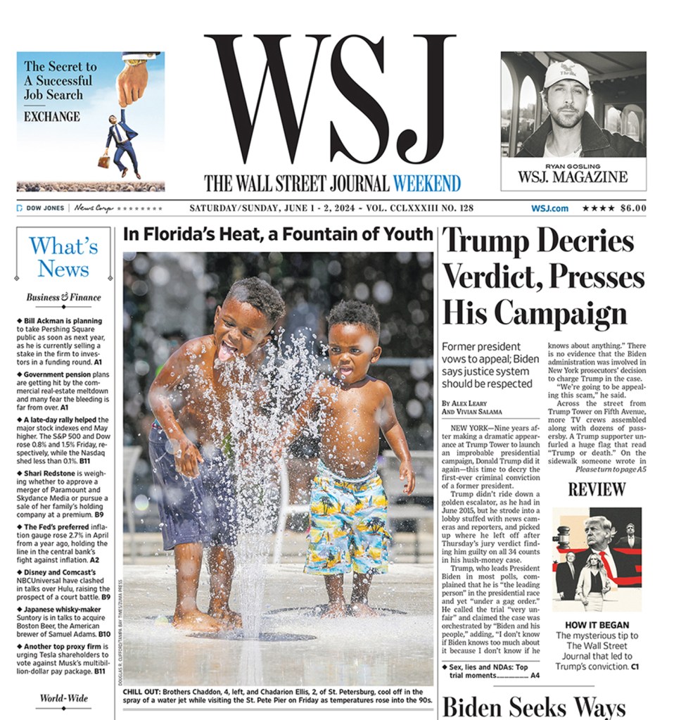 June 2, 2024: The Wall Street Journal Newspaper Cover A1. Image by Douglas R. Clifford/Tampa Bay TimesZUMA Press Wire shows Brothers Chaddon Ellis, 4, left, and Chadarion Ellis, 2, of St. Petersburg, cool off in the spray of a water jet while visiting the Splash Pad at the Spa Beach Bistro in St Petersburg on May 31, 2024. (Credit Image: © Wall Street Journal/ZUMA Press Wire)