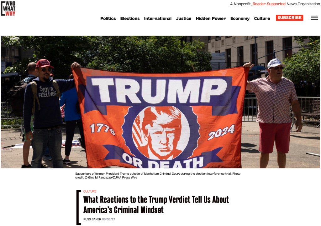 May 29, 2024, New York, New York, USA: Supporters of former President Trump outside of Manhattan Criminal Court during the continuing hush money trial wear hats that read ‘MAKE AMERICA GREAT AGAIN’ and hold a banner with an image of Trump that reads ‘TRUMP OR DEATH 1776 2024. The case charges that Trump orchestrated a cover-up of payments to the adult film actress known as S. Daniels as a means to interfere with the 2016 presidential election. (Credit Image: © Gina M Randazzo/ZUMA Press Wire)