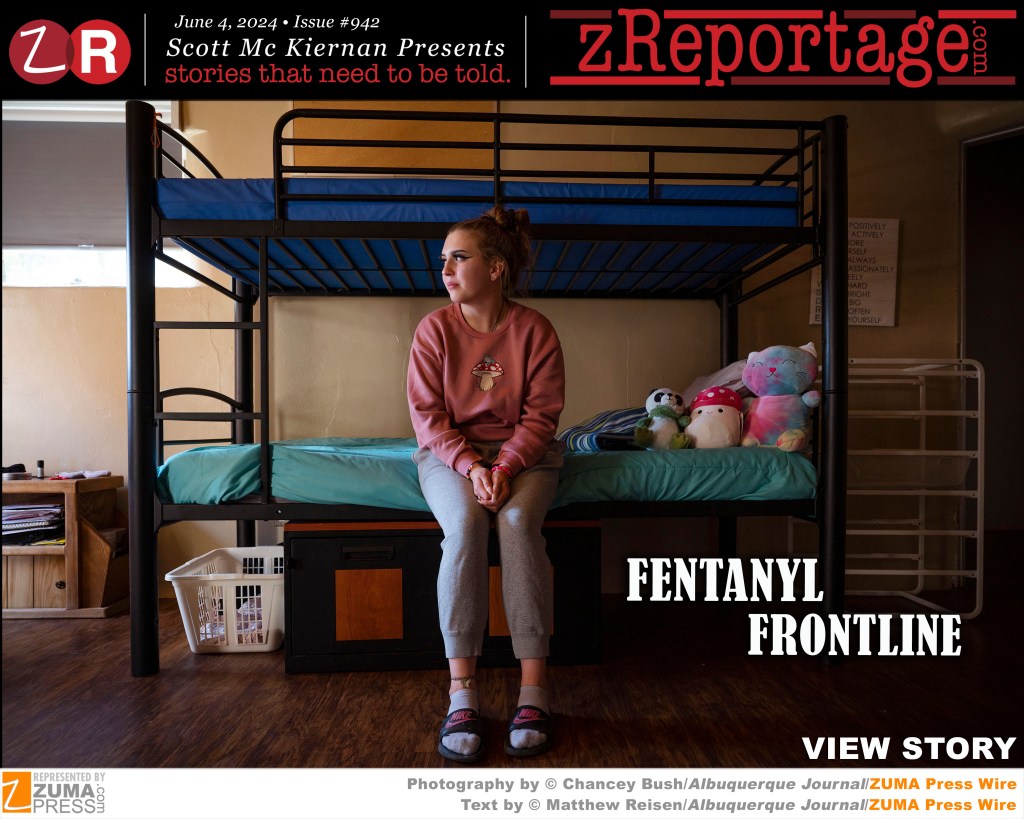 Scott Mc Kiernan Presents zReportage.com Issue #942 Story of the Week: Published TUESDAY June 4, 2024: ‘Fentanyl Frontline’ by ZUMA Partner newspaper The Albuquerque Journal photo-journalist Chancey Bush and story by staff writer Matthew Reisen: Several teens in recovery illustrate their addiction using colored pencils in a room at Serenity Mesa Youth Recovery Center in Albuquerque. Maddie, 18, uses a sharpie to write words like ”manipulator,” ”loss” and ”save me” in jagged letters swirling around a girl covering her eyes. All of the teens at Serenity Mesa had to detox, often undergoing serious withdrawals, in a mental hospital or jail cell. At first glance, you wouldn’t guess most of them have already been homeless, locked in a jail cell, overdosed on drugs and seen someone die from an overdose or shooting. Jennifer Weiss-Burke, executive director at the 14-bed facility in New Mexico, said the hurdles faced by youth suffering from an addiction are many. the state ranks second worst in the nation for youth suffering from a mental illness and among the worst for youth suffering from an addiction. Welcome to ‘Fentanyl Frontline’