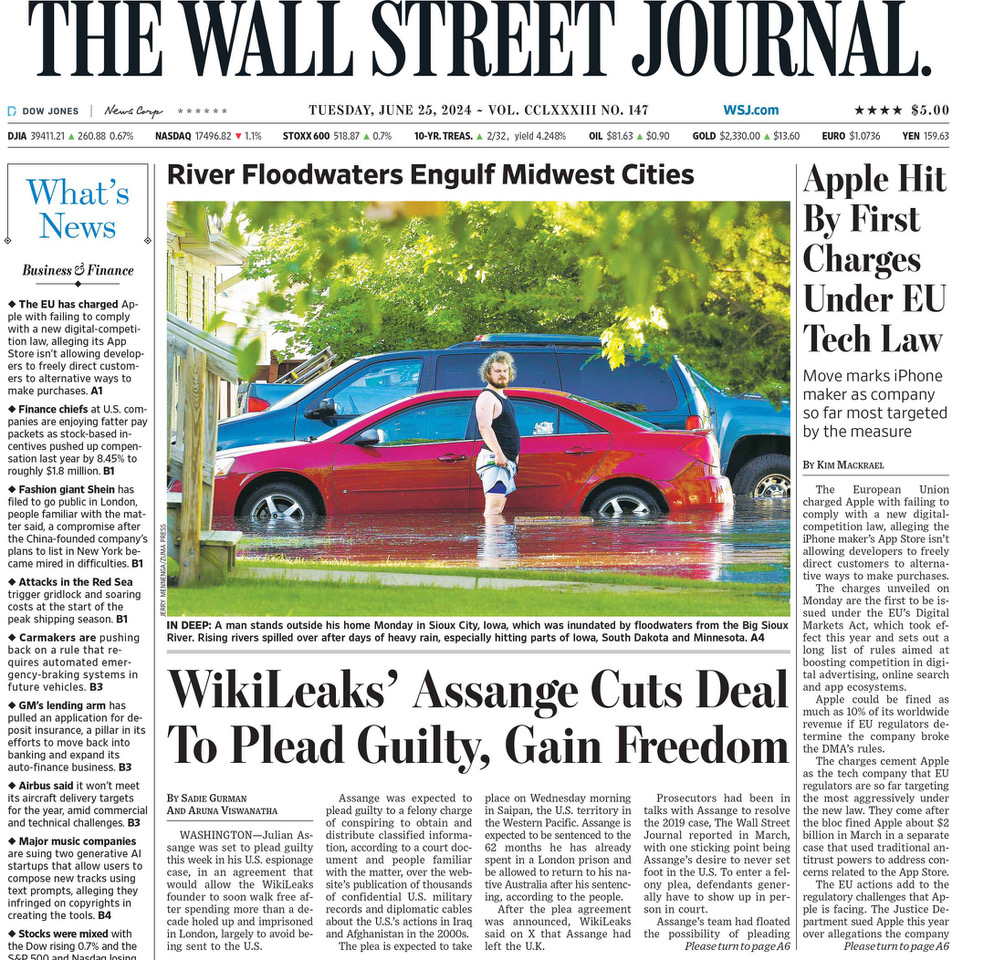 June 24, 2024, Sioux City, Iowa, USA: A resident tries to decide if he can move his vehicle from his flooding home as flooding from the Big Sioux River inundates Sioux City, Iowa residential area in the Riverside community. The Big Sioux River has crested at 45 feet, 7 feet above a flood record set a few years ago in 2019. (Credit Image: © Jerry Mennenga/ZUMA Press Wire)