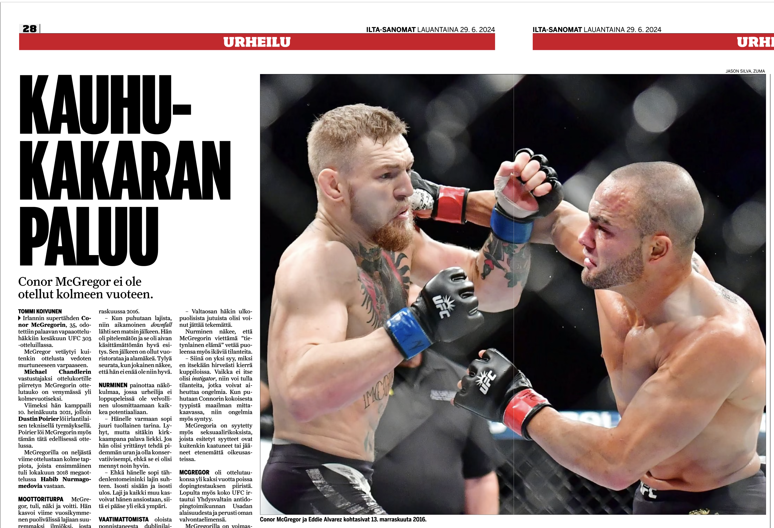 Nov 13, 2016 – New York, New York, U.S. – Eddie Alvarez (red gloves) vs. Conor ”The Notorious” McGregor (blue gloves) during UFC 205 at Madison Square Garden. (Credit Image: © Jason Silva/ZUMA Wire)