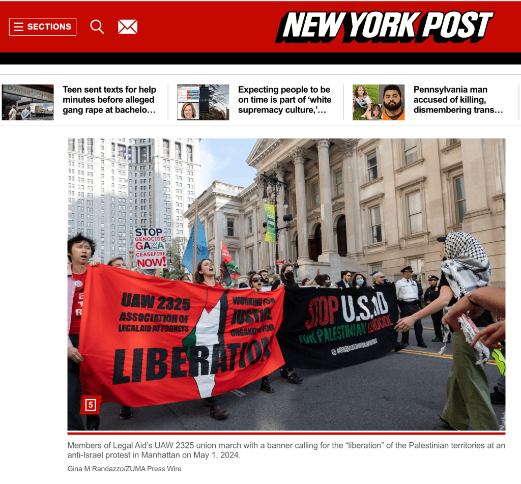 May 1, 2024, New York, New York, USA: People marching chant and hold banners that read ‘UAW 2325 ASSOCIATION OF LEGAL AID ATTORNEYS WORKING FOR JUSTICE ORGANIZING FOR LIBERATION’ ‘STOP U.S. AID FOR PALESTINIAN GENOCIDE.’ May Day Students and Workers Unite for Palestine protest begins in Foley Square in Manhattan’s Civic Center before thousands march through the streets. (Credit Image: © Gina M Randazzo/ZUMA Press Wire)