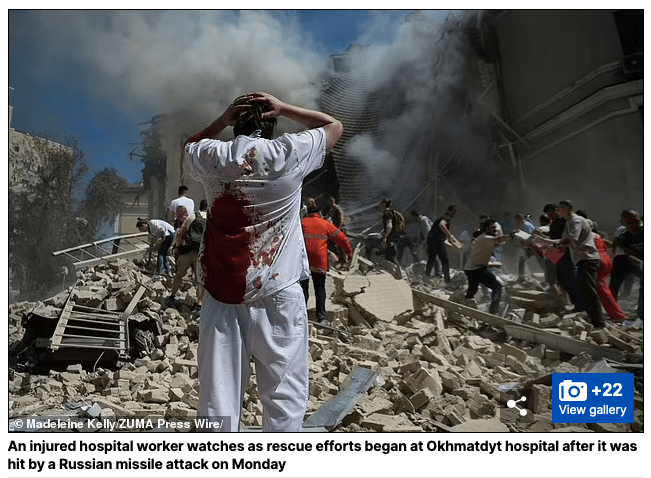July 8, 2024, Kyiv, Kyiv Oblast, Ukraine: An injured hospital worker watches as rescue efforts begin. Russian missile attacks on the city, damaged and partially destroyed a children’s hospital. (Credit Image: © Madeleine Kelly/ZUMA Press Wire)