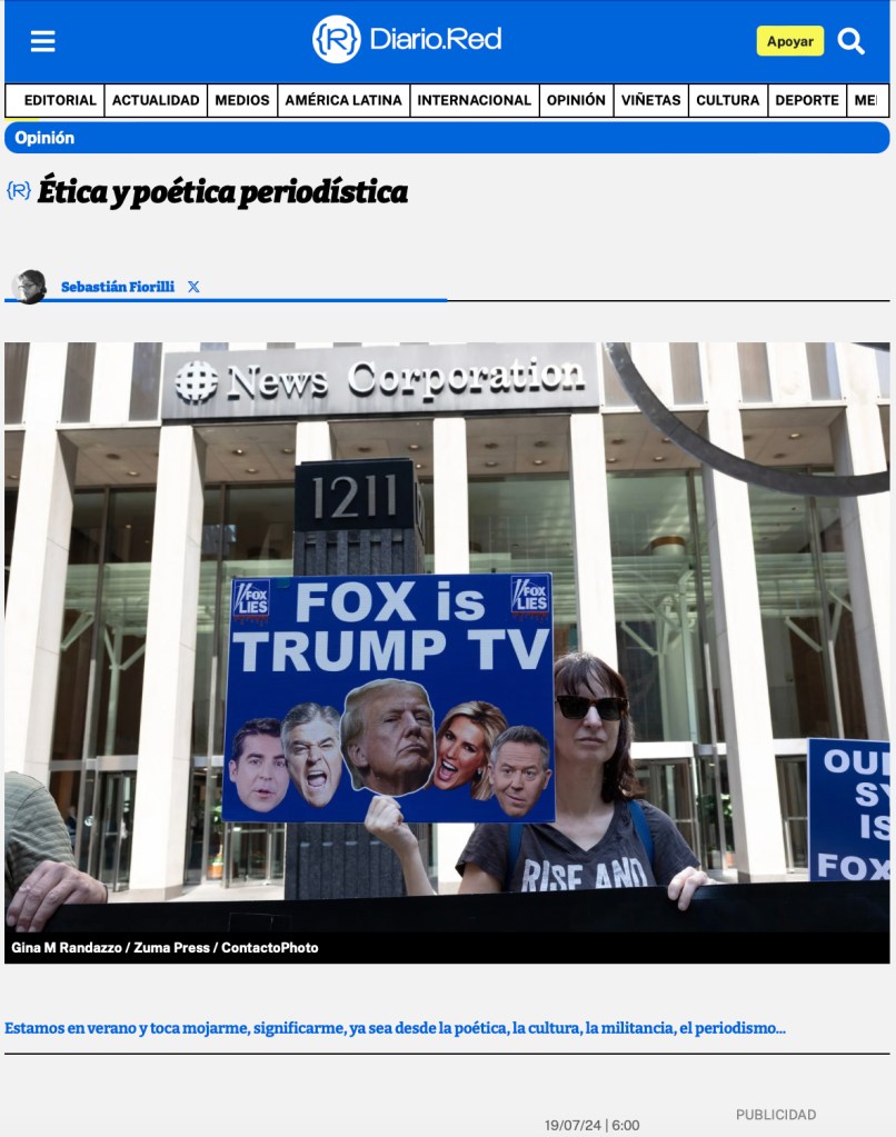June 4, 2024, New York, New York, USA: A protester holds a sign with images of Trump and Fox anchors that reads ‘FOX IS TRUMP TV.’ Protesters hold signs and banners outside of Fox News Channel demonstrating against the network’s ‘rigged trial’ coverage of the Trump hush money case and verdict which found former President Trump guilty on 34 counts. Demonstrators come to Fox News headquarters weekly for a Truth Tuesdays protest. (Credit Image: © Gina M Randazzo/ZUMA Press Wire)