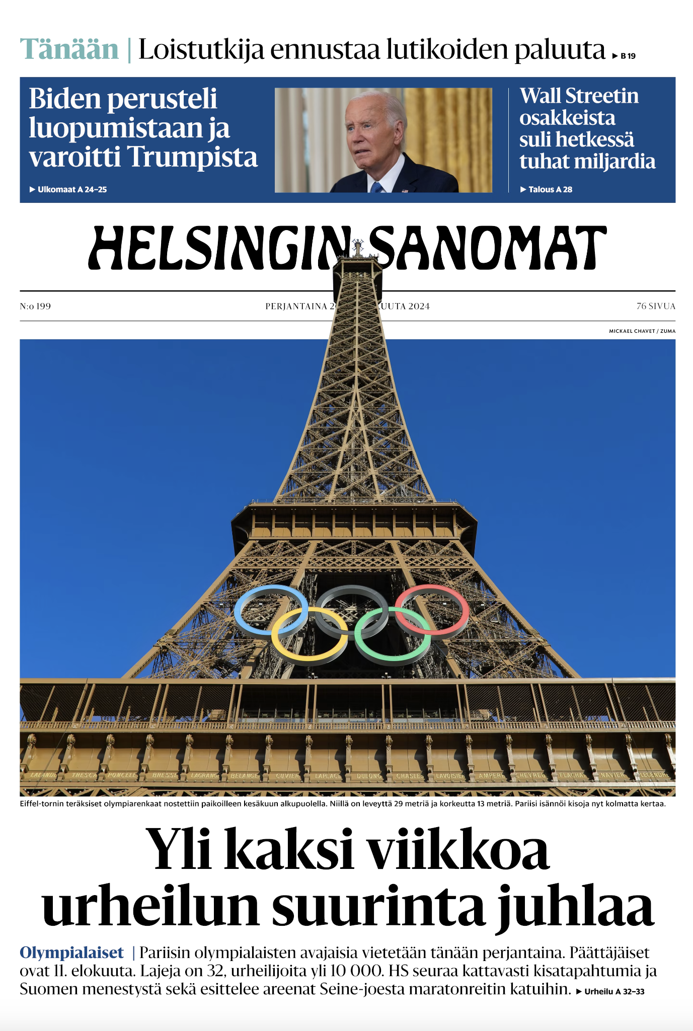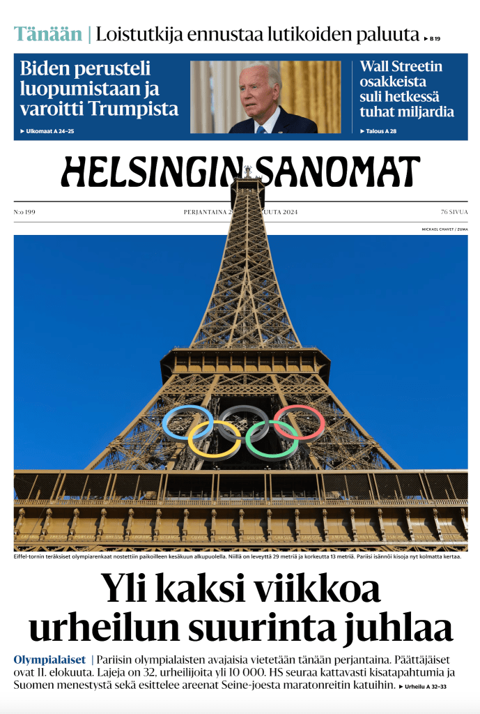 ZUMA’s Mickael Chavet on Helsingin Sanomat Posted by ZUMAPRESS.com on July 26, 2024 Posted in: ZUMALAND. Leave a comment July 10, 2024, Paris, Ile-De-France, France: The Eiffel Tower harbors the OLYMPIC RINGS for the Paris 2024 Olympic Games in Paris, France (Credit Image: © Mickael Chavet/ZUMA Press Wire) Scott Mc Kiernan, Founder & Editor-in-Chief, ZUMA Press Share this: Share on Facebook (Opens in new window) Facebook Share on LinkedIn (Opens in new window) LinkedIn Share on X (Opens in new window) X Like Loading... Related Posts navigation ← ZUMA on Helsingin Sanomat ZUMA’s Mark Hertzberg on The Guardian →