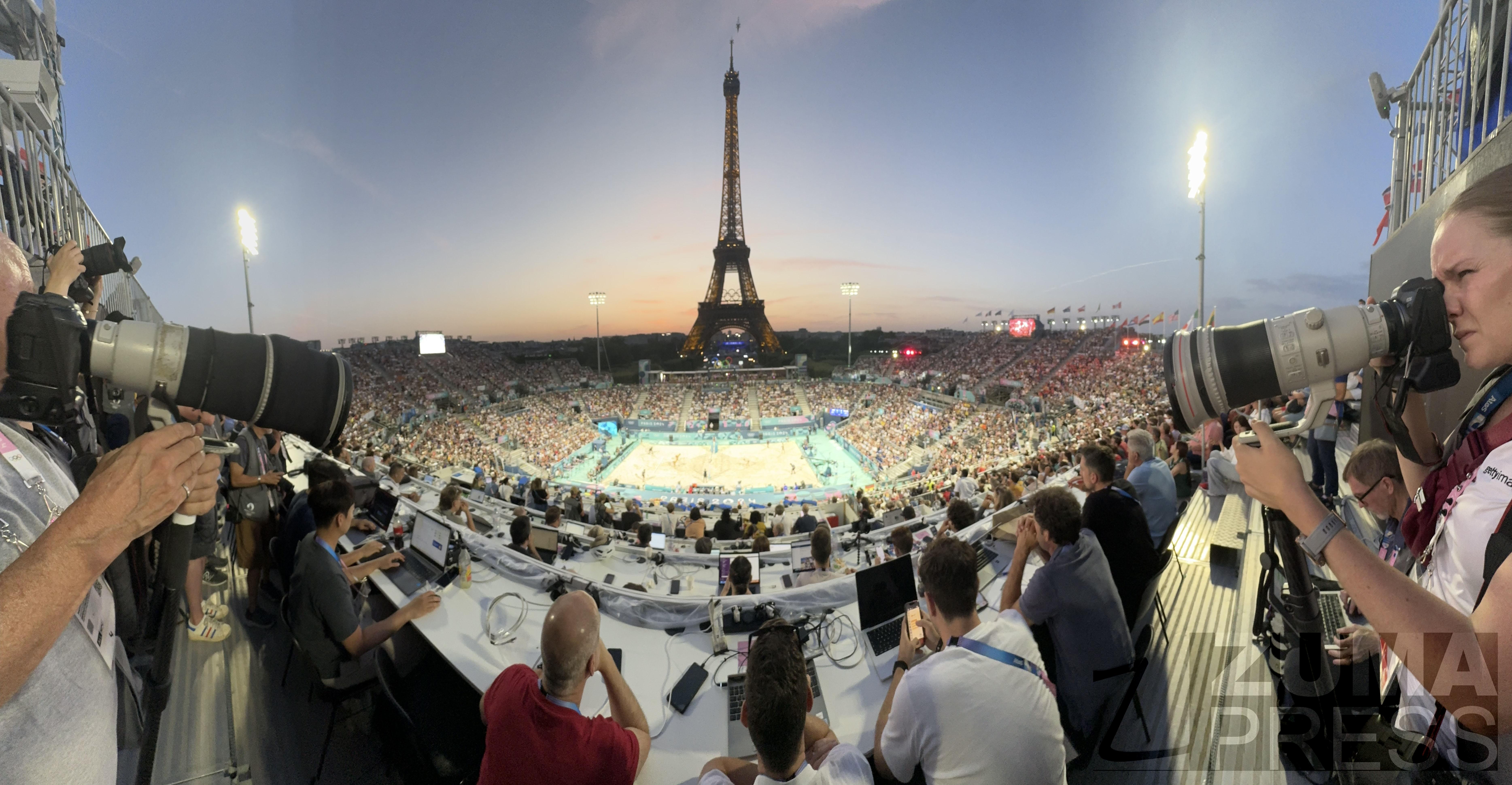 July 29, 2024, Paris, Ile de France, France: Photographers face-off during France vs. Germany at the Preliminary Phase, Pool F Women’s Beach Volleyball match, Stade Tour Eiffel stadium during the 2024 Paris Summer Olympics. France won 2-0. (Credit Image: © Scott Mc Kiernan/ZUMA Press Wire)