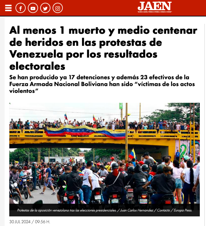 ZUMA’s Juan Carlos Hernandez on Jaen Posted by ZUMAPRESS.com on August 5, 2024 Posted in: ZUMALAND. Leave a comment July 29, 2024: July 29, 2024. Venezuelans protest in the streets, in the city of Valencia, Carabobo state. Photo: Juan Carlos Hernü¡ndez (Credit Image: © Juan Carlos Hernandez/ZUMA Press Wire) Scott Mc Kiernan, Founder & Editor-in-Chief, ZUMA Press Share this: Click to share on Facebook (Opens in new window) Facebook Click to share on LinkedIn (Opens in new window) LinkedIn Click to share on X (Opens in new window) X Like Loading... Related Posts navigation ← ZUMA’s Gina M Randazzo on The Guardian ZUMA’s Juan Carlos Hernandez on Letras Libres →