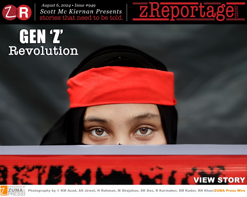 Scott Mc Kiernan Presents zReportage.com Issue #949 Story of the Week: Published: TUESDAY August 6, 2024: ‘GEN ‘Z’ Revolution’ by ZUMA Press Bangladeshi photo-journalist’s KM Asad, AS Jewel, H Rahman, M Shajahan, SK Das, R Karmaker, SM Kader, RH Khan: Bangladesh’s youth-led uprising has led to the ousting of PM Sheikh Hasina. The movement, fueled by economic disparities and political dissatisfaction, highlights the potential for change and the challenges ahead for Bangladesh’s future. The autocratic leader of over 15 years, Hasina fled the country in the face of defiant public demand for her resignation. More than 300 civilians were killed and over 20,000 injured, making the bloodshed among the worst ever witnessed in Bangladesh. Young people have played a pivotal role in bringing down Hasina’s government, offering hope of a bottom-up transition to democracy for the South Asian country. Welcome to ‘GEN ‘Z’ Revolution’