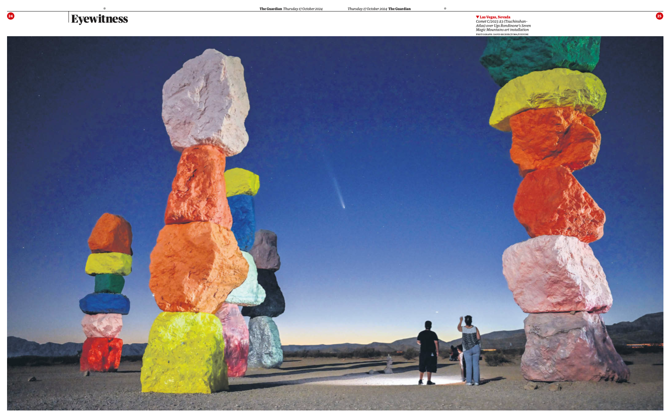Oct. 15, 2024 – Las Vegas, Nevada, U.S. – People gather to watch Comet C/2023 A3 (Tsuchinshan-ATLAS) as it appears in the sky over the Seven Magic Mountains art installation by artist Ugo Rondinone, on October 15, 2024 near Las Vegas. The comet also known as Comet A3, is about 44 million miles from Earth and likely originated from the Oort Cloud. It last passed Earth 80,000 years ago. (Credit Image: © David Becker/ZUMA Press Wire)