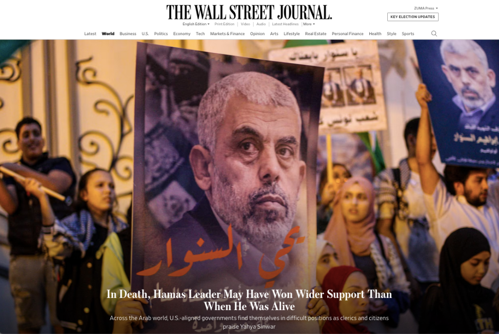 October 18, 2024, Tunis, Tunisia: A protest takes place outside the municipal theatre in Tunis against Israel’s recent assassination of Hamas leader Sinwar. Protesters held images of Sinwar and waived Palestinian flags and other symbols of the Palestinian resistance. Hamas’ top leader Sinwar was killed by Israeli soldiers in Rafah, in the south of the Gaza Strip, on Thursday. (Credit Image: © Hasan Mrad/IMAGESLIVE via ZUMA Press Wire)