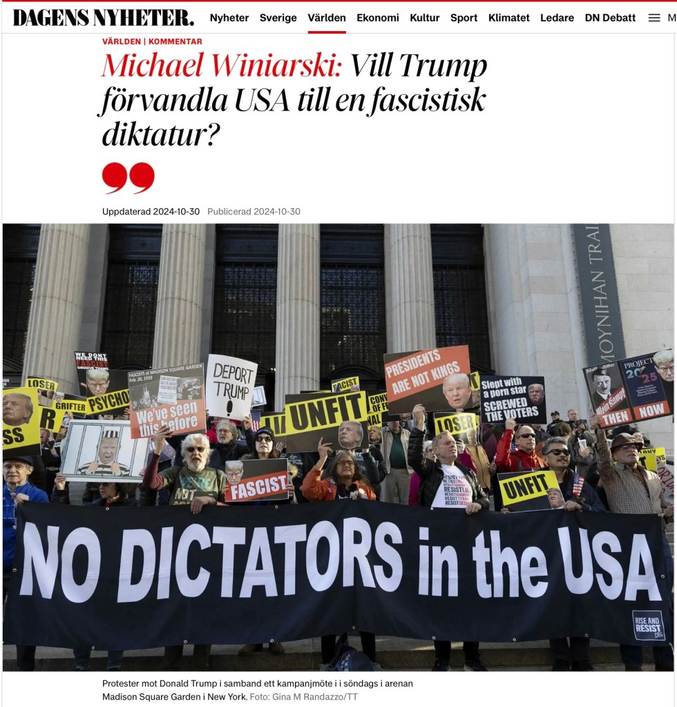 October 27, 2024, New York, New York, USA: Anti-Trump protesters with the activist group Rise & Resist stage a non-violent demonstration holding signs & banners near Madison Square Garden, the site of large campaign rally and fundraiser for former President Trump where Trump will appear along with high profile Republicans and supporters. A banner reads ‘NO DICTATORS in the USA’ and signs with images of Trump read ‘PRESIDENTS ARE NOT KINGS’ ‘UNFIT’ ‘FASCIST’ ‘We’ve seen this before’ ‘Slept with a porn star SCREWED THE VOTERS’ ‘LOSER.’ Massive security from the Secret Service and NYPD have converged on midtown Manhattan in anticipation of potential violence. The protesters state that Trump is unfit to serve as President and his agenda is anti-LGBTQ, misogynist, and fascist. They demand No Trump, No Project 2025, no Republican agenda in NYC. The rally is being compared to the Pro America Rally at the Garden in 1939 attended by Nazi supporters of Hitler. (Credit Image: © Gina M Randazzo/ZUMA Press Wire)