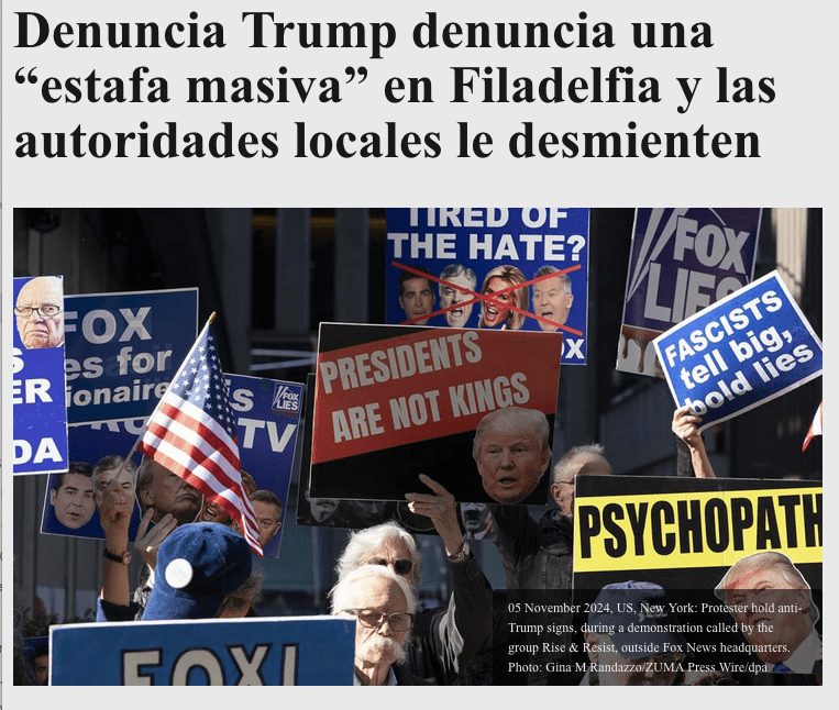 November 5, 2024, New York, New York, USA: On Election Day anti-Trump protesters with the activist group Rise & Resist demonstrate outside of Fox News. People hold signs with images of Trump and Fox anchors that read ‘PRESIDENTS ARE NOT KINGS’ ‘FASCISTS tell big, bold lies’ ‘TIRED OF HATE?’ PSYCHOPATH.’ U.S. citizens have their final opportunity today to cast their votes for president. Polls predicting the outcome of the election between former President Trump & Vice President Harris remain mostly tied. (Credit Image: © Gina M Randazzo/ZUMA Press Wire)