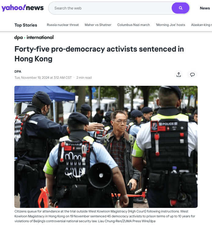 November 19, 2024, Hong Kong, China: In Hong Kong, outside West Kowloon Magistracy (High Court), a policemen rush to stop a woman from displaying banner written both in English and Chinese : [ God is With You ], a gesture of protest on the day of landmark trial and sentencing for 45 Hong Kong Democrats charged with ‘ subversion ‘ under political trial this morning. (Credit Image: © Liau Chung-ren/ZUMA Press Wire)