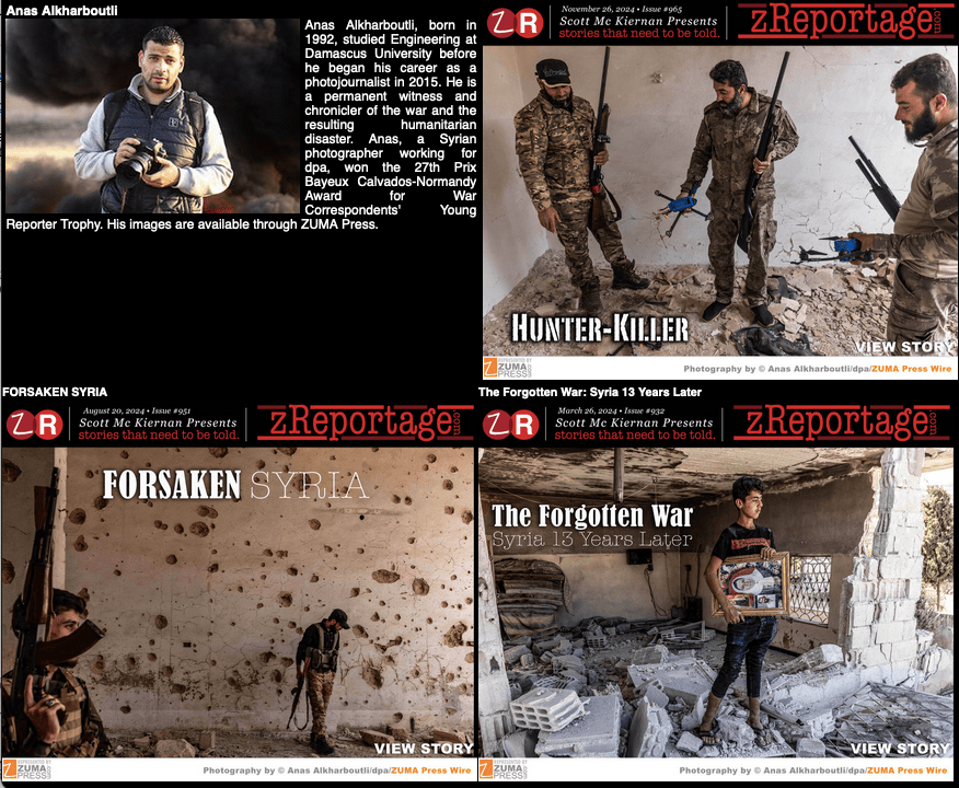 ZUMA is sad to report that photojournalist ANAS ALKHARBOUTLI was killed on December 4, 2024 in an airstrike on Morek, near the city of Hama, Syria. Alkharboutli was covering the rebel offensive, according to his employer the German news agency Deutsche Presse-Agentur (DPA). Alkharboutli’s work was featured in many zReportage issues, as recent as last week.