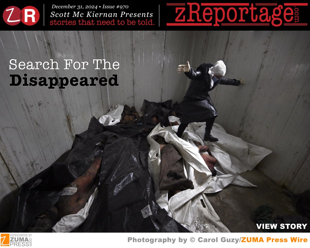 Scott Mc Kiernan Presents zReportage.com Issue #970 Story of the Week: Published TUESDAY, December 31, 2024: ‘Search For The Disappeared’ Pictures by 4 time Pulitzer Prize winning ZUMA Press photographer Carol Guzy in Damascus: Images of tortured victims bodies cover the the outside walls of Al-Mujtahid Hospital in central Damascus. Every day, since the fall of Syrian dictator Bashar al-Assad’s regime, a crowd of family members mothers, sisters, fathers, brothers come together to examine this wall of horror. They look closely at the disfigured corpses with smashed faces some with no eyes, in the hope of recognizing a lost loved one who disappeared into Syria’s notorious prison system during the 13 year civil war. On December 8, a rebel offensive led by the Islamist group Hayat Tahrir al-Sham ousted President Bashar al-Assad. The Syrian Observatory for Human Rights estimates more than 100,000 people died in Syrian prisons during a brutal regime. Welcome to: ‘Search For The Disappeared’