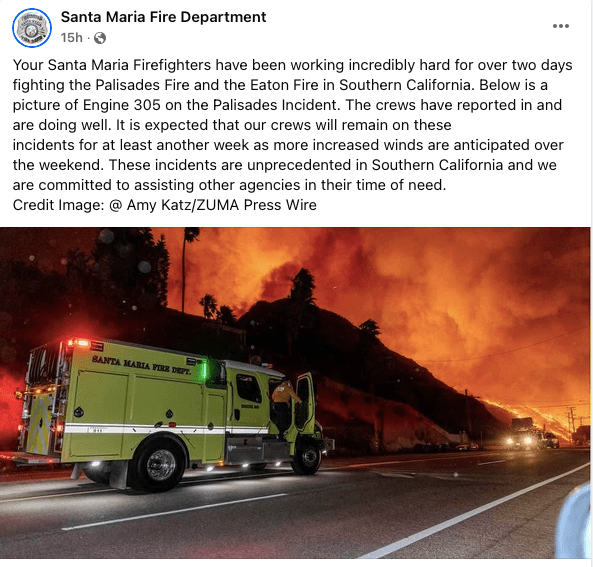 ZUMA’s Amy Katz has been covering the fires in Southern California and is featured on the Santa Maria Fire Department’s page.