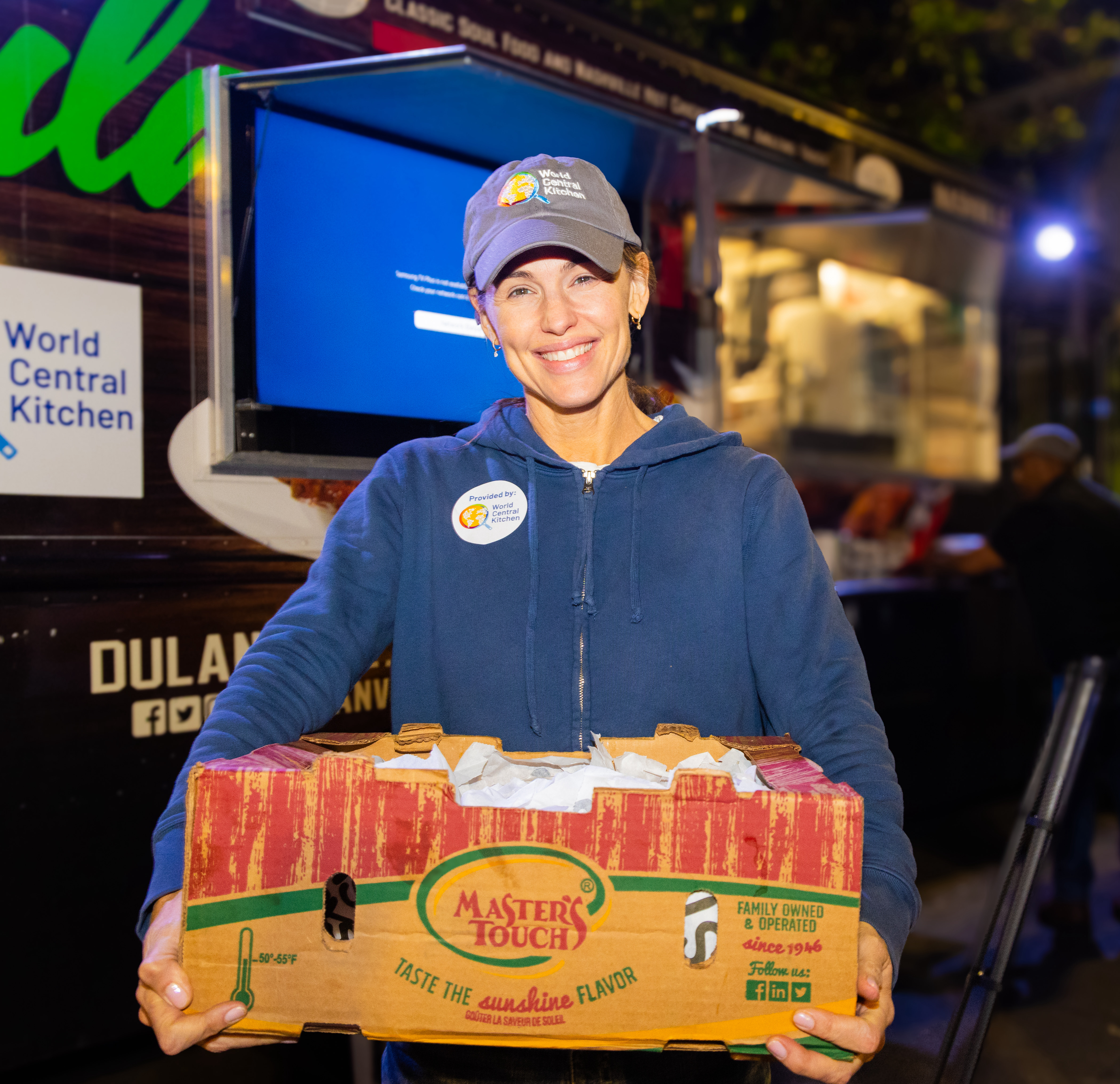 January 10, 2025, Pacific Palisades, California, USA: WCK Volunteer and Actress Jennifer Garner carries out bagels in front of the Food truck helping to prepare food for the World Central Kitchen (WCK). They are there to feed California fire victims and anyone else who come from a food truck owned by Greg Dolan, owner of Dulan’s Soul Food Restaurant and Catering Co., at the temporarily shut down Jack in the Box in the city of Altadena, which has been decimated by the Eaton fire. (Credit Image: © Amy Katz/ZUMA Press Wire)