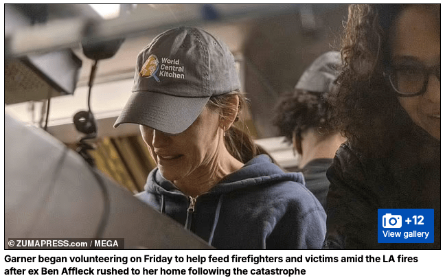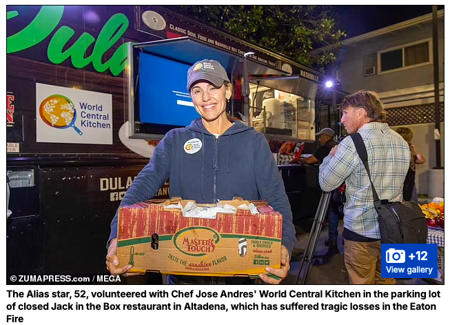 January 10, 2025, Altadena, California, USA: American movie-star JENNIFER GARNER, 52, volunteers to help victims of Eaton Fire. Garner revealed a friend from church perished in LA wildfire disaster. On Friday, the actress, 52, partnered with World Central Kitchen and Chef José Andrés to feed firefighters and evacuees from the Los Angeles wildfires from a Jack in the Box parking lot in Altadena. Dressed casually for the occasion in jeans, a zip-up sweatshirt and baseball cap, Garner carried a box of food from the truck out to those waiting. The mom-of-three resides in Brentwood, a neighborhood next to the largely destroyed Pacific Palisades neighborhood. “I did lose a friend, and for our church, it’s really tender so I don’t feel like we should talk about it yet,” Garner told a journalist, choking up. “I did lose a friend. She didn’t get out in time.” “I feel almost guilty walking through my house.” She added, “You know, what can I do? How can I help? What can I offer? What do I have to offer with these hands and these walls and the safety that I have?” Garner said Andrés, the chef’ serving those affected by the fires, “is an incredible thing to watch.” “I’ve lived in and around the Palisades for 25 years, so I just think all of us, we want to get our hands into working, somehow, to be helpful,” she continued. “And because of my work with Save The Children, we have a relationship with the chef, and I was able to just say, ‘Can I be with you for the day? What can I do to help? Put me to work.’” World Central Kitchen (WCK) founder world famous Chef José Andrés feeds fire victims and anyone else who stops in for a meal and community love. (Credit Image: © Amy Katz/ZUMA Press Wire)