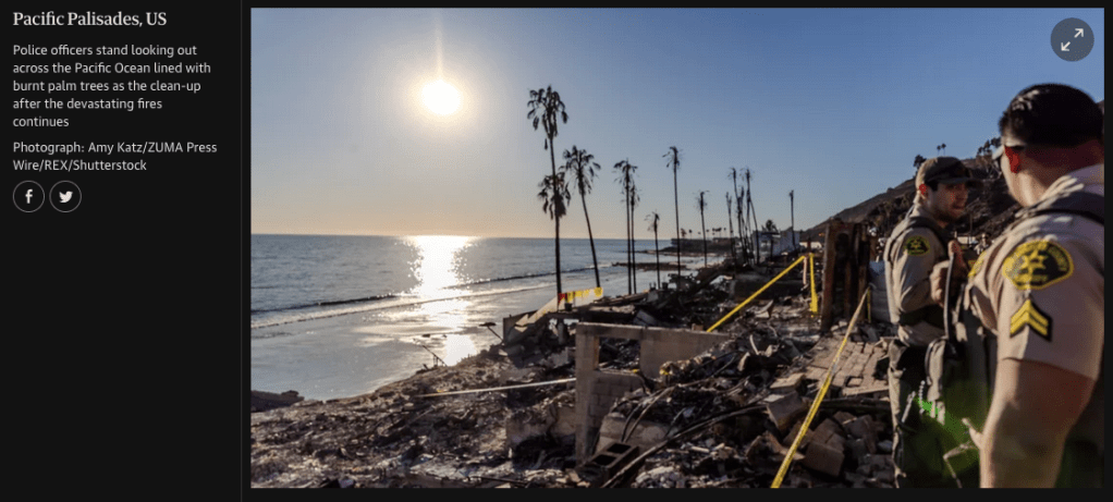 January 14, 2025, Pacific Palisades, California, USA: The Mexican military has come to assist America’s National Urban Search & Rescue (US&R) and Cal Fire to find human remains in the homes and businesses that burnt during the Palisades Fire. They stand on a destroyed structure, overlooking the Pacific Ocean, lined with burnt palm trees, along the Pacific Coast Highway, after a long day of sifting through toxic debris. (Credit Image: © Amy Katz/ZUMA Press Wire)