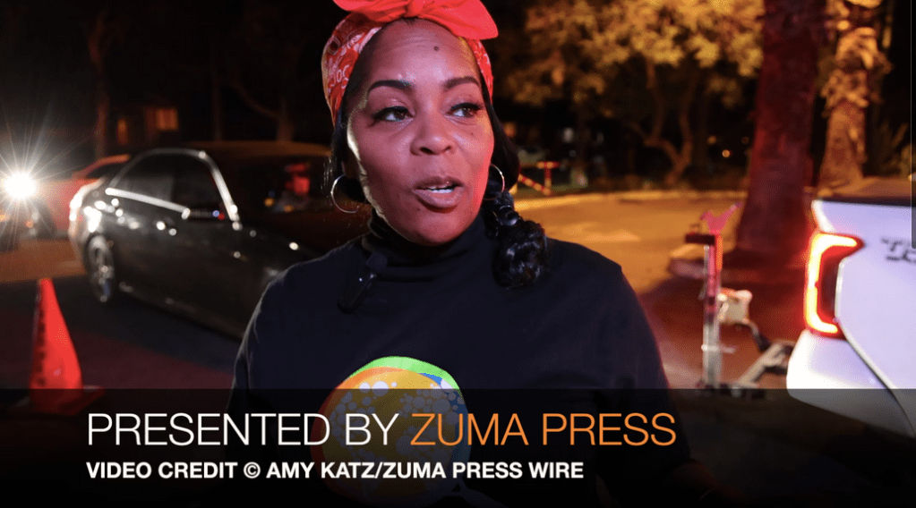 Kim Prince, Manager of Hotville Chicken, and partnering with Dulanville Food Truck and World Central Kitchen, speaks about providing food for the Altadena and Pasadena community that has been devastated by the Eaton Fire, at the Lake Street Washington Ave temporary World Central Kitchen site, as an endless stream of vehicles with local residents drives up to get free chicken and gravy dinners on January 21, 2025.