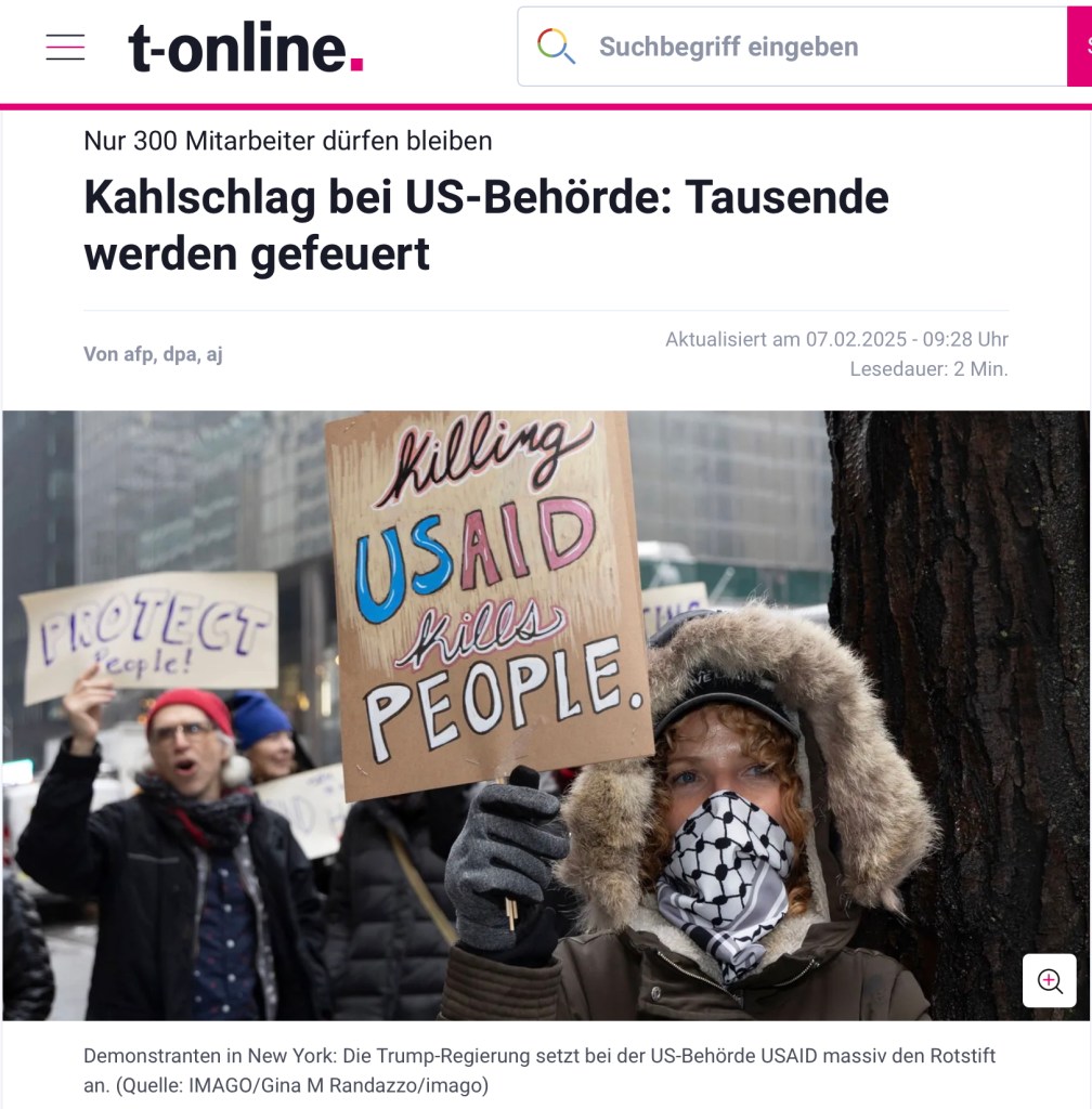 February 6, 2025, New York, New York, USA: A demonstrator holds a sign that reads ‘Killing USAID Kills People.’ outside the Manhattan offices of Senators Schumer and Gillibrand. In the rain constituents chant and hold signs demanding that the Democratic leadership use every procedural tool to grind Senate business to a halt and fight President Trump’s extremist MAGA agenda. (Credit Image: © Gina M Randazzo/ZUMA Press Wire)