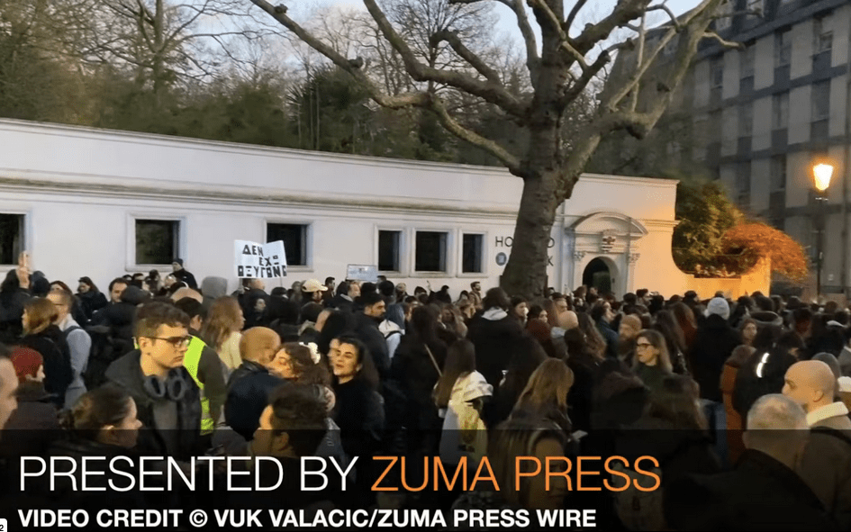 February 28, 2025, London, England, UK: Members of the Greek diaspora gather outside the Greek Embassy on the second anniversary of the Tempi train crash. 57 people died when trains collided in 2023.