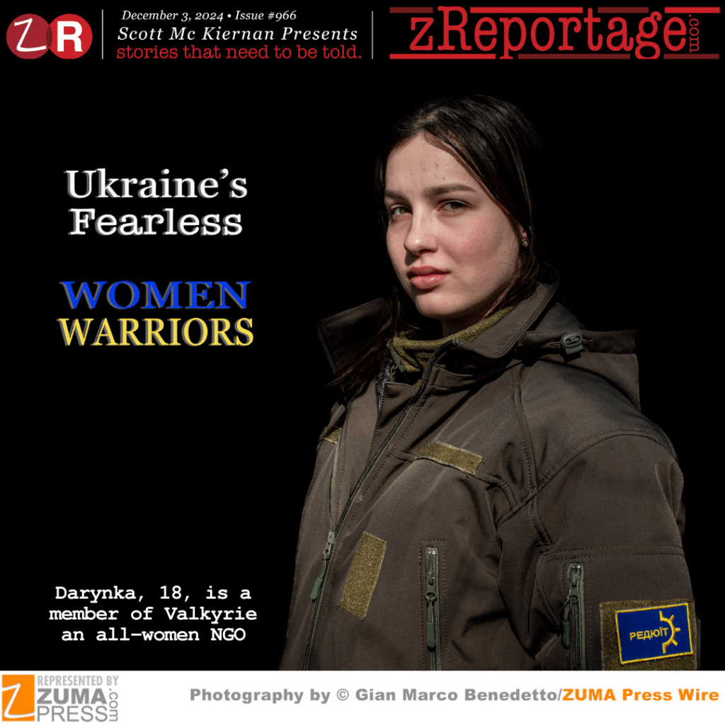 Scott Mc Kiernan presents zReportage.com Issue #979 Story of the Week: Published TUESDAY March 4, 2025: ‘Ukraine’s Fearless WOMEN WARRIORS’ by ZUMA Press award winning photographer Gian Marco Benedetto: The call to fight for freedom is being answered by Ukrainian women, who are finding their strength and bravery. In Ukraine, conscription is mandatory only for men. Despite that, more than 45,000 women have voluntarily joined the Armed Forces of Ukraine and are currently serving alongside men. Since Russia’s large-scale invasion of Ukraine in 2022, women’s rights organizations and women leaders have been providing humanitarian assistance, advocating for women’s rights, taking on leadership roles in business and in politics, and many have joined the armed forces. Welcome to ‘Ukraine’s Fearless WOMEN WARRIORS’ .