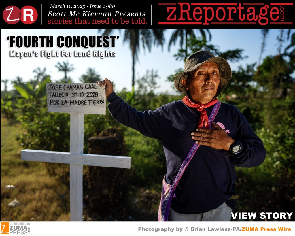 Scott Mc Kiernan Presents zReportage.com Issue #980 Story of the Week: Published TUESDAY March 11, 2025: ‘FOURTH CONQUEST: Mayan’s Fight For land Rights’ by ZUMA Press award winning PA Wire photo-journalist Brian Lawless: The Mayan people’s struggle to keep their ancestral land has been described as ‘the fourth conquest’ and like ‘fighting a monster’. Indigenous Mayans in Guatemala have called for a halt on multinational companies coming to their communities and extracting resources. Local people believe that big agriculture and mining have destroyed the natural environment, affecting their crops and polluting the water. Unlike the historical conquests, today the community is optimistic, they have legal papers that they say will determine the land is theirs. Local spokesman Gilberto Ichich said they don’t want their territory to be ‘invaded’ by these companies. ‘We don’t want any mining, we don’t want any palm tree oil palms here, we want them out. We don’t want any more damage, we just want to be (left) in peace.’ Welcome to ‘FOURTH CONQUEST: Mayan’s Fight For land Rights’