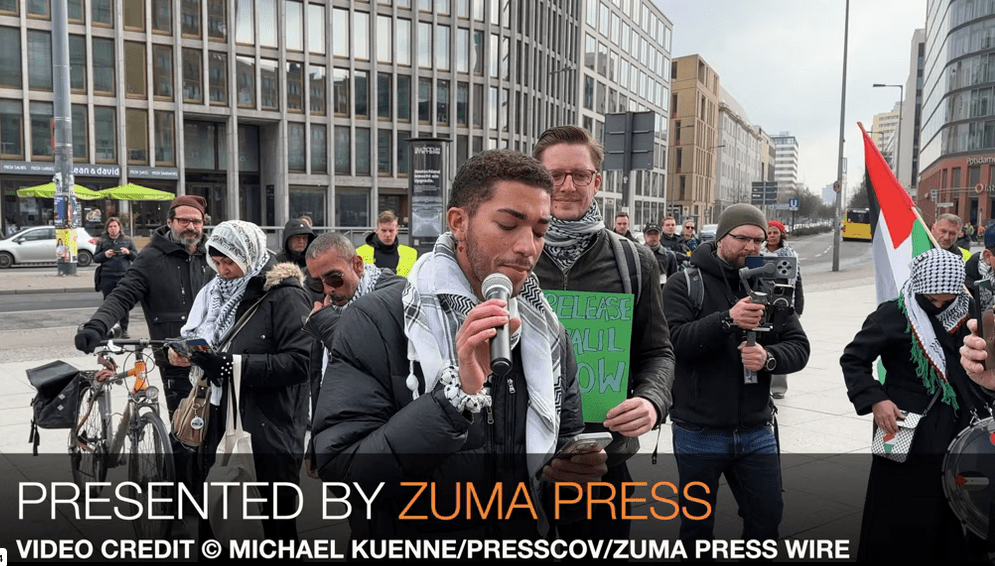 March 15, 2025, Berlin, Berlin, Germany: Pro-Palestine protesters gathered at Potsdamer Platz in central Berlin, waving Palestinian flags and wearing traditional keffiyehs to demand the immediate release of Mahmoud Khalil, a Palestinian activist detained by U.S. immigration authorities. The protest, held in solidarity with former Columbia University students, underscored growing international outrage over his arrest and ongoing detention. The protest featured a speech by Cameron Jones, a Columbia University student and activist, who called for Khalil’s immediate freedom.
