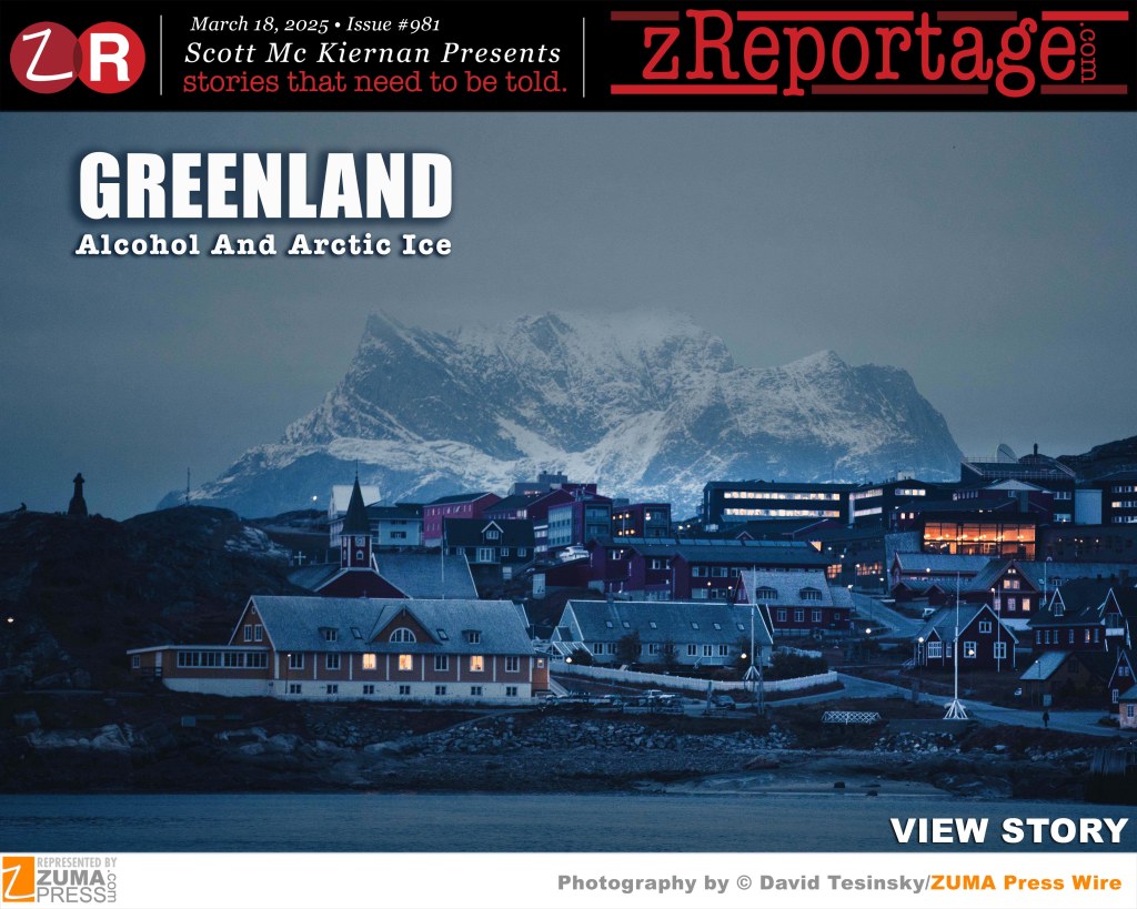 Scott Mc Kiernan Presents zReportage.com Issue #981 Story of the Week: Published TUESDAY March 18, 2025: ‘GREENLAND: Alcohol And Arctic Ice’ by ZUMA Press award winning photographer David Tesinsky: Greenland with only sixty thousand inhabitants and huge mineral wealth, is the largest island in the world and a self-ruling Danish territory which has recently undergone a national election, seen protests seeking autonomy and become the target of President Trump, who wants to somehow ”get” the territory for the US. According the International Journal of Health alcohol is the single most important public health challenge in Greenland, including high rates of binge drinking and harmful consumption, with approximately 40 percent of the population showing these patterns. The Government of Greenland, known as Naalakkersuisut with WHO has launched a project to develop recommendations for a new national alcohol policy, addressing a long-running public health challenge. Welcome to ‘GREENLAND: Alcohol And Arctic Ice’