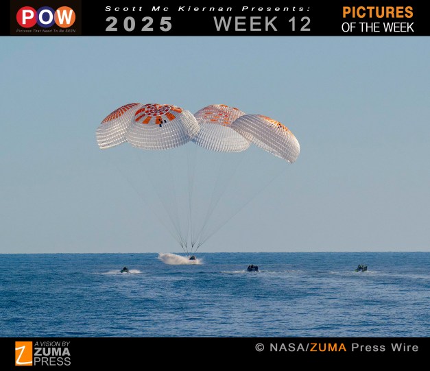 March 18, 2025, Coast Of Tallahassee, Florida, USA: SpaceX Dragon spacecraft is seen as it lands with NASA astronauts Nick Hague, Suni Williams, Butch Wilmore, and Roscosmos cosmonaut Aleksandr Gorbunov aboard in the water off the coast of Tallahassee, Florida. Hague, Gorbunov, Williams, and Wilmore are returning from a long-duration science expedition aboard the International Space Station. (Credit Image: © NASA via ZUMA Press)