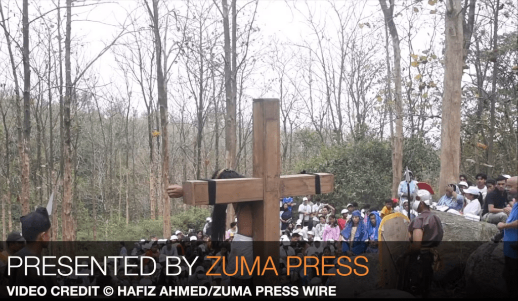 April 18, 2025, Guwahati, Assam, India: Christian devotees participate in the re-enactment of the crucifixion of Jesus Christ during a procession on Good Friday in Guwahati, Assam, India on Friday, April 18, 2025. Good Friday commemorates the crucifixion of Jesus Christ and his death at Calvary. It is observed during Holy Week on the Friday before Easter Sunday, as part of the Paschal Triduum.