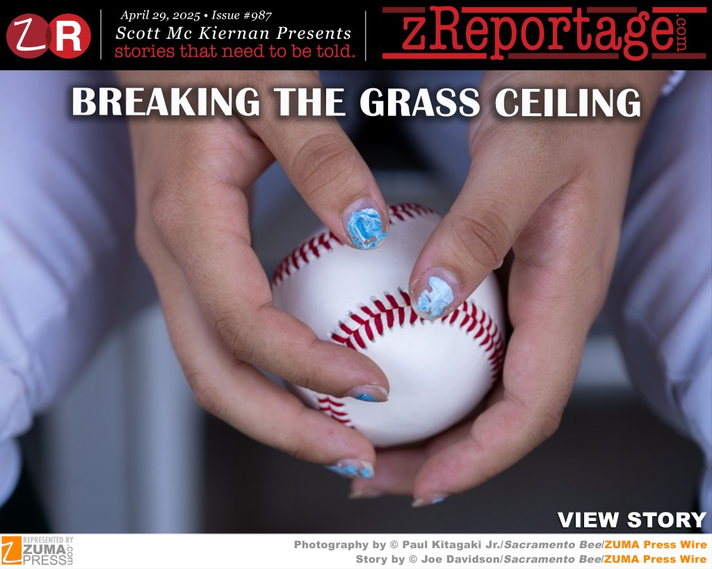 Scott Mc Kiernan Presents zReportage.com Issue #987 Story of the Week: Published TUESDAY, April 29, 2025: ‘Breaking The Grass Ceiling’ Pictures by ZUMA Press represented Sacramento Bee’s photographer Paul Kitagaki Jr. and story by staff writer Joe Davidson: A record nine women suited up for teams at the collegiate level in 2024, with more on the way, while a movement to make women’s baseball a college sport is gaining momentum. Kennedy Cougars team captain and pitcher Laney Fukuoka has heard it all. The out-loud wise cracks, the subtle digs, the snickers. The High School senior pitcher has also caught the expressions of discord and doubt when taking the mound, the rolled eyes, the nodding of the head, the deep sighs. The heckling line most common? ”She throws like a girl!” Well, shoot, man. News flash: She is a girl. The path to Major League Baseball is a straightforward run for boys and young men, but a new women’s league (WPBL) hopes to create a similar baseball pipeline for girls and young women in the not-too-distant future. Welcome to ‘Breaking The Grass Ceiling’
