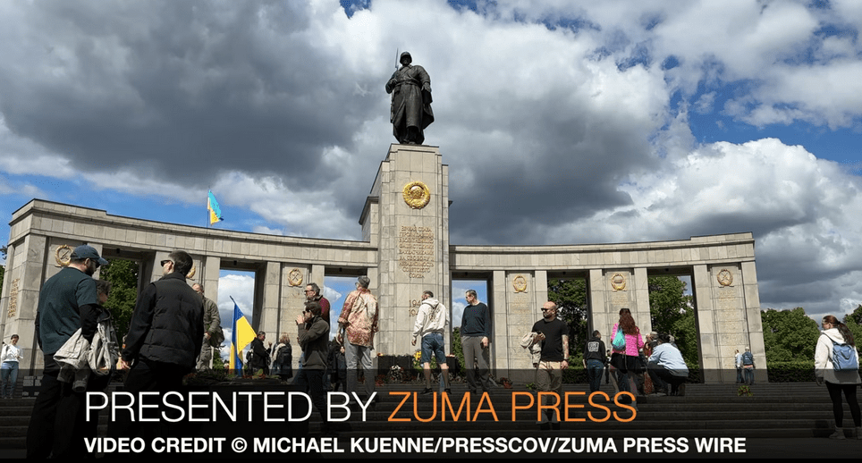 May 8, 2025, Berlin, Germany: Hundreds gathered at Berlin’s Soviet War Memorial in Tiergarten on Thursday, May 8, 2025, to mark the 80th anniversary of Victory in Europe (VE) Day, as police enforced tight security and upheld a ban on Russian flags and symbols. The annual commemoration, which honors the Allied victory over Nazi Germany and the end of World War II in Europe on May 8, 1945, drew participants carrying Ukrainian, NATO, and European Union flags. Many flowers were laid at the memorial, some bearing ribbons inscribed with “Glory to the Heroes” alongside Ukrainian national symbols. The solemn remembrance took place under heightened police presence, with officers deployed from across Germany. Access points to the memorial were controlled with fences and thorough inspections. Berlin police maintained a ban on Russian and Soviet flags, military uniforms, medals, martial songs, and symbols supporting Russian war in Ukraine. The anniversary is a public holiday in Berlin, and commemorations took place across the city at multiple Soviet memorials.