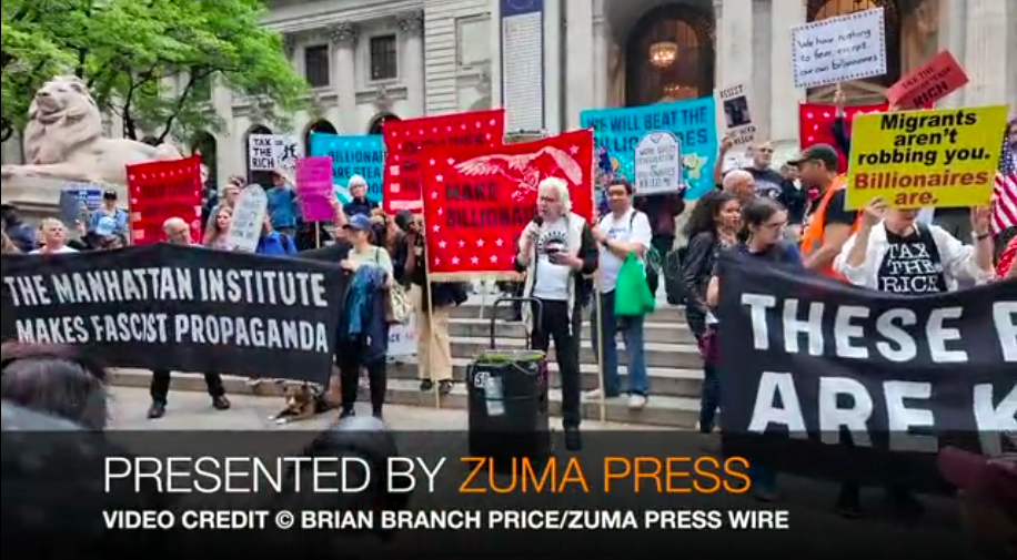 May 7, 2025, New York, New York, U.S: Demonstrators appear at the New York Library for MAGA Billionaire Blockade demonstration in New York. The Demonstrators marched to a Trump fundraiser at a gala at Cipriani’s restaurant near Grand Central Station on 42nd Street. Several demonstrators were arrested.