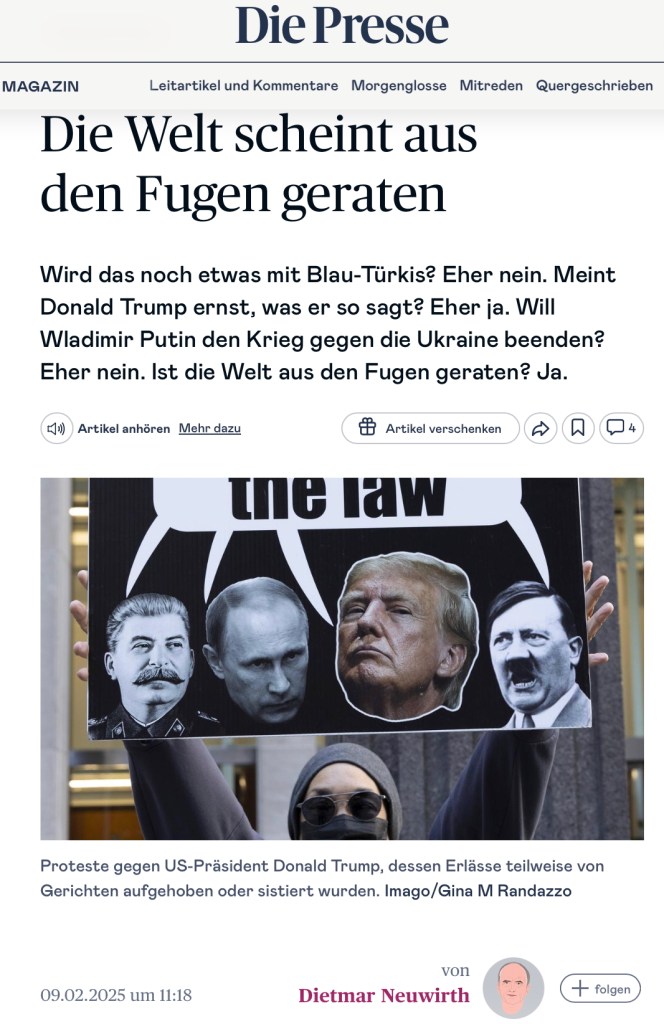 February 4, 2025, New York, New York, USA: A demonstrator with the activist group Rise & Resist protests against Fox News and owner R. Murdoch’s propaganda in support of President Trump’s actions since taking office, holding a sign that reads ‘I’m above the law’ with images of Stalin, Putin, Hitler and President Trump with a quote bubble. Protesters stand on the plaza outside Fox headquarters and denounce the President for shifting the government toward an oligarchy and fascism with an agenda they call misogynist, anti-reproductive rights, anti-LGBTQ+, anti-immigrant, and pro-billionaire. Fox News currently dominates ratings and has seen its audience surge since the election. (Credit Image: © Gina M Randazzo/ZUMA Press Wire)