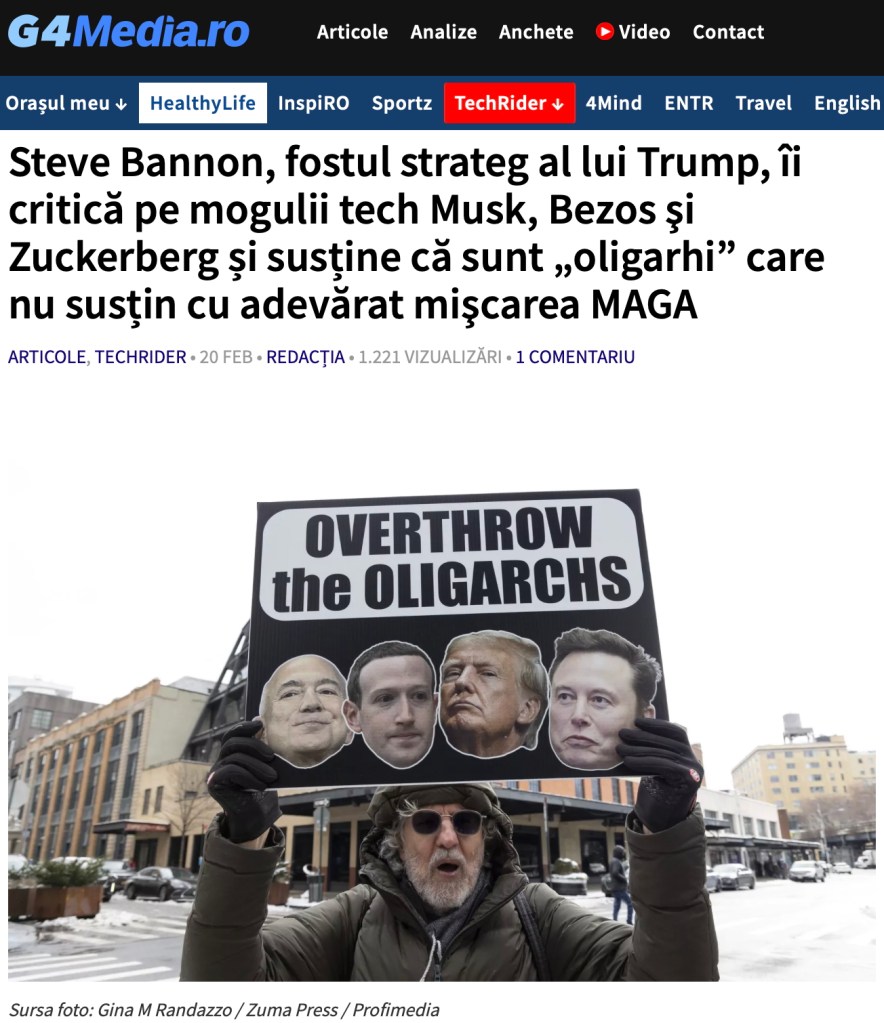 February 9, 2025, New York, New York, USA: A demonstrator holds a sign that reads ‘OVERTHROW the OLIGARCHS’ with images of Bezos, Zuckerberg, President Trump & Musk outside the Tesla Showroom in Manhattan’s West Village. The activist group Rise & Resist holds a Stop the Musk-Trump Coup protest on Super Bowl Sunday in response to President Trump and E. Musk’s actions at the United States DOGE Service (Credit Image: © Gina M Randazzo/ZUMA Press Wire)