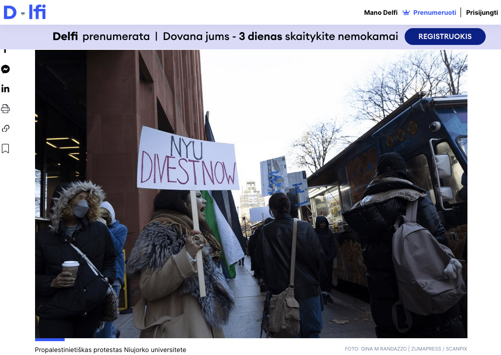 December 12, 2024, New York, New York, USA: Pro-Palestine students and supporters hold signs in a picket line outside of New York University’s Elmer Holmes Bobst Library. A sign reads ‘NYU Divest Now.’ Demonstrators call for NYU to disclose and divest from all investments in weapons manufacturing, surveillance, and industries related to the Israeli occupation of Palestine. (Credit Image: © Gina M Randazzo/ZUMA Press Wire)