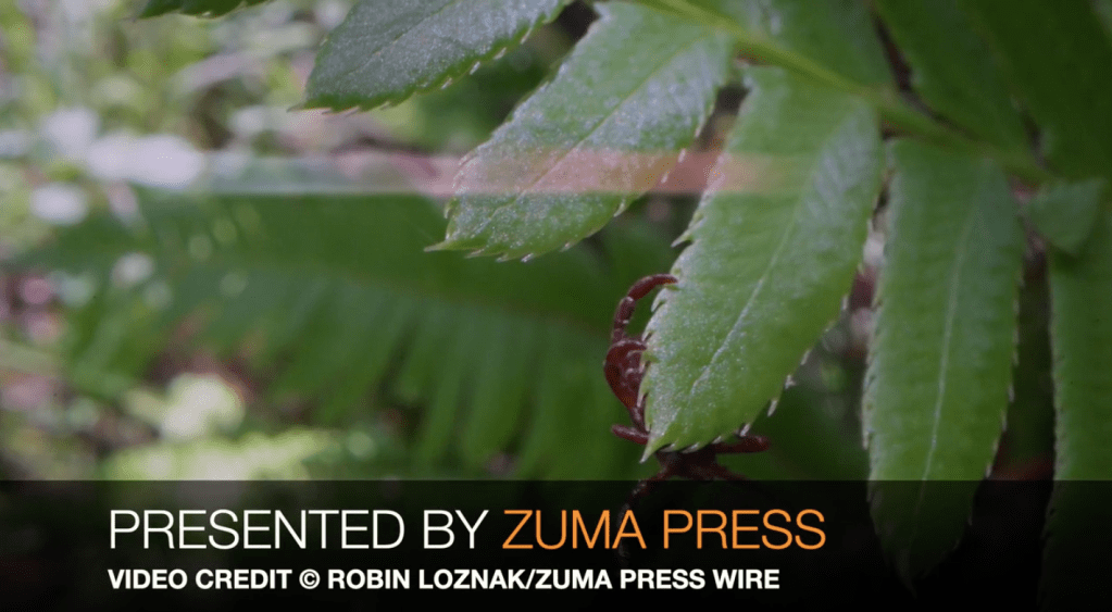 May 23, 2025, Elkton, Oregon, USA: A dog tick, also known as wood tick, waits for a passing animal as it clings to a fern along a game trail near the Umpqua River in rural southwestern Oregon. Dozens of ticks were climbing on ferns in a small area along the trail. Ticks thrive in humid, moist environments. The area had an extremely rainy late winter and early spring which may have contributed to the tick population boom.