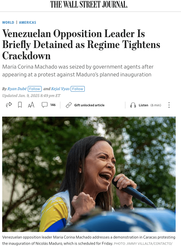 January 9, 2025, Caracas, Miranda, Venezuela: The leader of the opposition Maria Corina Machado, appears at the rally of the opposition called by her, in the streets of Caracas…Government and opposition marches and rallies prior to the presidential inauguration on January 10, 2025. Caracas, Venezuela (Credit Image: © Jimmy Villalta/ZUMA Press Wire)