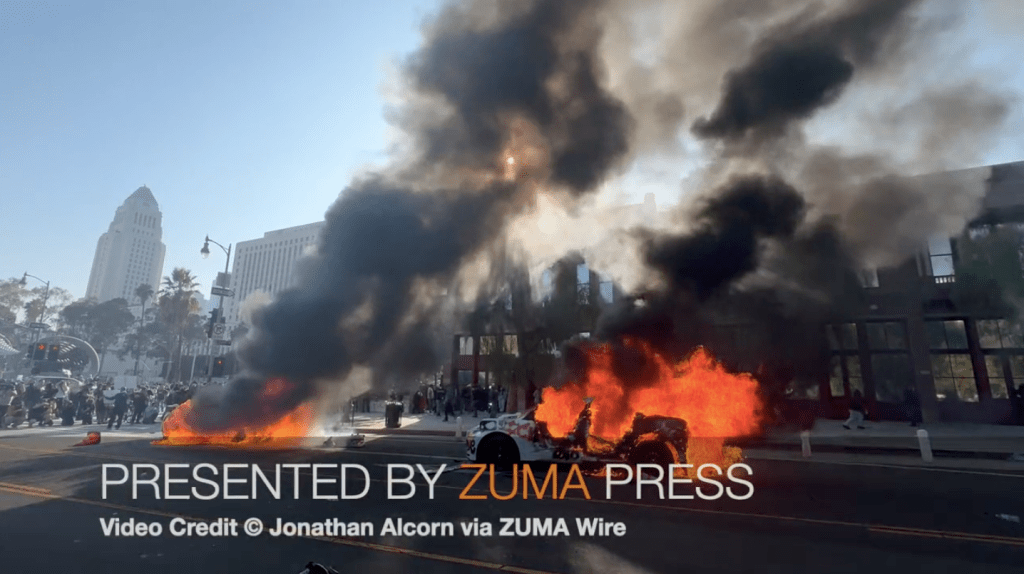June 8, 2025, Los Angeles, California, USA: Waymo self driving taxi’s burning during protests against ICE and Donald Trump’s immigration policies in downtown Los Angeles.