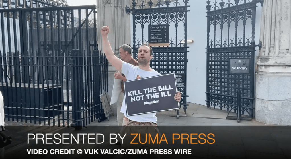 June 20, 2025, London, United Kingdom: Both supporters and opponents of the Assisted Dying Bill gather in Parliament Square as MPs continue to debate the bill.