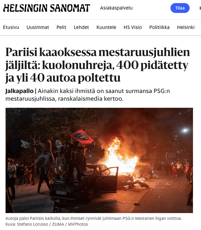 ZUMA Coverage of Football Fans Celebrating in Paris, on Helsingin Sanomat Posted by ZUMAPRESS.com on June 27, 2025 Posted in: ZUMALAND. Tagged: champions-league, football, soccer, Sports, uefa. Leave a comment May 31, 2025, Paris, France, FRA: Outside the Parc des Princes, a sea of joy and fireworks: Paris Saint-Germain fans erupt in celebration after their team’s stunning 5-0 triumph over Inter Milan in Munich. With this historic victory, PSG becomes only the second French football club‒after Olympique de Marseille in 1993‒to lift the UEFA Champions League trophy. A night of chants, flags, and tears of happiness marked a long-awaited moment for supporters across the capital. However, the festivities were marred by clashes between some groups of fans and the police, with several cars set on fire and tensions flaring in the surrounding streets. (Credit Image: © Stefano Lorusso/ZUMA Press Wire/ZUMA Wire) June 1, 2025, Paris, France, FRA: Outside the Parc des Princes, a sea of joy and fireworks: Paris Saint-Germain fans erupt in celebration after their team’s stunning 5-0 triumph over Inter Milan in Munich. With this historic victory, PSG becomes only the second French football club‒after Olympique de Marseille in 1993‒to lift the UEFA Champions League trophy. A night of chants, flags, and tears of happiness marked a long-awaited moment for supporters across the capital. However, the festivities were marred by clashes between some groups of fans and the police, with several cars set on fire and tensions flaring in the surrounding streets. (Credit Image: © Stefano Lorusso/ZUMA Press Wire/ZUMA Wire)May 31, 2025, Paris, France, FRA: Outside the Parc des Princes, a sea of joy and fireworks: Paris Saint-Germain fans erupt in celebration after their team’s stunning 5-0 triumph over Inter Milan in Munich. With this historic victory, PSG becomes only the second French football club‒after Olympique de Marseille in 1993‒to lift the UEFA Champions League trophy. A night of chants, flags, and tears of happiness marked a long-awaited moment for supporters across the capital. However, the festivities were marred by clashes between some groups of fans and the police, with several cars set on fire and tensions flaring in the surrounding streets. (Credit Image: © Stefano Lorusso/ZUMA Press Wire/ZUMA Wire)May 31, 2025, Paris, France: Outside the Parc des Princes, a sea of joy and fireworks: Paris Saint-Germain fans erupt in celebration after their team’s stunning 5-0 triumph over Inter Milan in Munich. With this historic victory, PSG becomes only the second French football club after Olympique de Marseille in 1993 to lift the UEFA Champions League trophy. (Credit Image: © Stefano Lorusso/ZUMA Press Wire/ZUMA Wire)June 1, 2025, Paris, Ile-De-France (Region, France: Incidents broke out in Paris following the Champions League Final won by PSG in Paris on June 1, 2025. – 01/06/2025 – France / Ile-de-France (region) / Paris – Julien Mattia / Le Pictorium (Credit Image: © Julien Mattia/Le Pictorium Agency via ZUMA Press)June 1, 2025, Paris, Ile-De-France (Region, France: Incidents broke out in Paris following the Champions League Final won by PSG in Paris on June 1, 2025. – 01/06/2025 – France / Ile-de-France (region) / Paris – Julien Mattia / Le Pictorium (Credit Image: © Julien Mattia/Le Pictorium Agency via ZUMA Press)June 1, 2025, Paris, Paris, France: PSG-Inter Milan: after Paris won the Champions League final, there were scenes of jubilation in the capital, particularly in Repuplique where hundreds of fans gathered to celebrate the Parisian club’s victory.. – 01/06/2025 – France / Paris / Paris – Jan Schmidt-Whitley (Credit Image: © Jan Schmidt-Whitley/Le Pictorium Agency via ZUMA Press)June 1, 2025, Paris, Paris, France: PSG-Inter Milan: after Paris won the Champions League final, there were scenes of jubilation in the capital, particularly in Repuplique where hundreds of fans gathered to celebrate the Parisian club’s victory.. – 01/06/2025 – France / Paris / Paris – Jan Schmidt-Whitley (Credit Image: © Jan Schmidt-Whitley/Le Pictorium Agency via ZUMA Press) Share this: Click to share on Facebook (Opens in new window) Facebook Click to share on LinkedIn (Opens in new window) LinkedIn Click to share on X (Opens in new window) X Like Loading... Related Posts navigation ← ZUMA’s Coverage of the California Fires on Ilta Sanomat ZUMA’s Kenneth Martin Photograph Made Illustration on Reason →