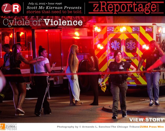 Scott Mc Kiernan Presents zReportage.com Issue #996 Story of the Week: Published: TUESDAY July 15, 2025: ‘Cycle Of Violence’ by ZUMA Press represented Chicago Tribune photojournalist’s: Brian Cassella, John J. Kim, Terrence Antonio James, Antonio Perez, Armando L. Sanchez, Chris Sweda and Peter Tsai. The city of Chicago saw a historic drop in homicides in the first half of the year, a trend that has largely been mirrored nationwide. However a new report shows a decreasing percentage of Chicagoans survive gunfire. Researchers and experts say access to more lethal weapons and devices that make guns more dangerous are to blame. Chicago experiences devastating levels of violence, from 2016 through 2020, 3,276 people were killed with another 13,546 non-fatal shooting victims. Deadly shootings have made up a steadily larger share of the city’s gun violence statistics, according to data from the Chicago Violence Reduction Dashboard and studies from the University of Chicago Crime Lab. As summer brings warmer weather the city of Chicago normally sees an uptick in violence. The number of people slain so far in 2025: 219. That’s 97 fewer people killed when compared with 2024. Welcome to ‘Cycle Of Violence’