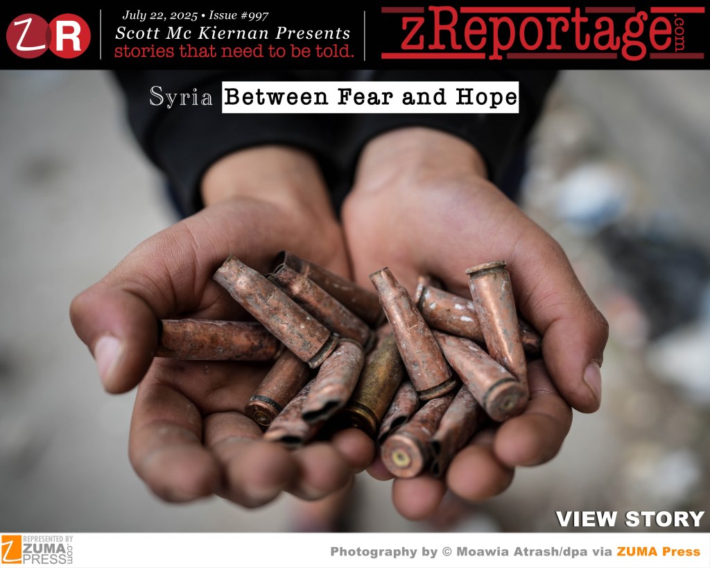 Scott Mc Kiernan presents zReportage.com Issue #997 Story of the Week: Published TUESDAY July 22, 2025: ‘Syria: Between Fear and Hope’ by ZUMA Press award winning dpa photo-journalist Moawia Atrash: Just eight months after the ouster of Bashar al-Assad, many Syrians fear they have merely exchanged one autocrat for another. Confronted with a battered economy and sectarian opposition to his rule, President Ahmed al-Sharaa governs a fractured country still reeling from drought and the aftermath of the country’s 13-year civil war. A surge in sectarian violence in southern Syria and Israeli airstrikes reaching central Damascus have pushed the war?scarred country into a volatile juncture, a senior UN official said on Thursday, warning that renewed violence could shatter prospects for peace and fuel wider regional instability. Welcome to ‘Syria: Between Fear and Hope’